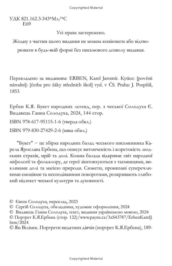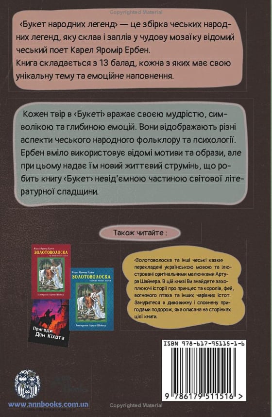 "Букет народних легенд" – це збірка захоплюючих чеських легенд, які вражають своєю глибиною та колоритом. Кожна історія наповнена таємничими подіями та моральними уроками, що залишають слід у душі. Це видання чудово підійде для тих, хто цікавиться народною творчістю, культурою та історією Чехії.